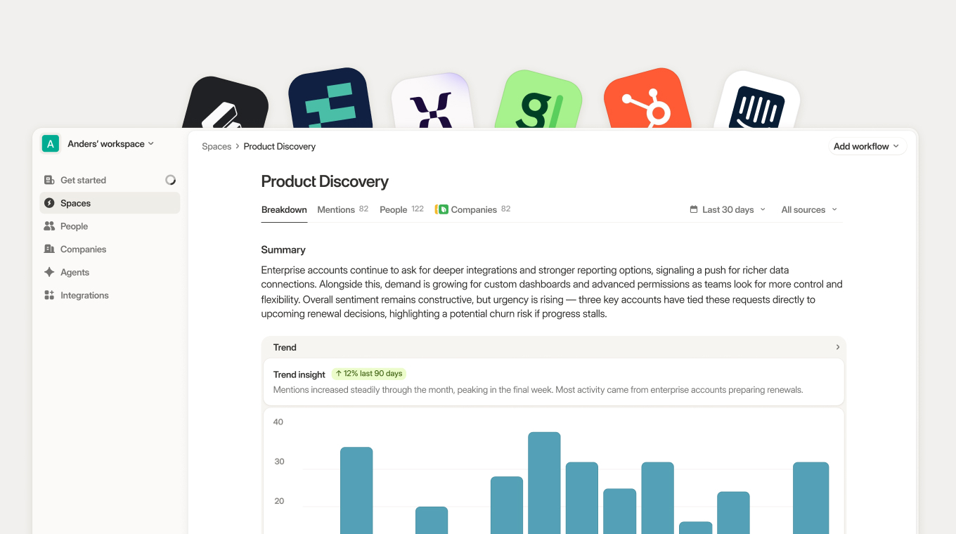 With an operating system for customer intelligence:Product gets closed-lost deal intelligence automatically. Sales sees churn signals across support and usage. CX spots product gaps from interview data. Marketing validates messaging from actual customer conversations. Design sees what users need from every source.