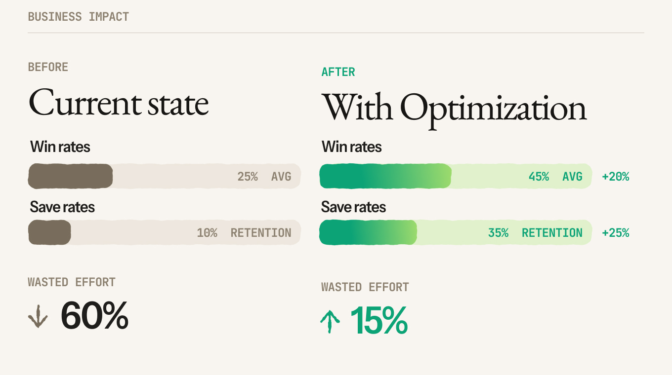 For Product: 16% lost because of a missing integration reps never asked about. They added it to discovery. Deals that would die at contract now die in week one when you can pivot. Wasted pipeline dropped 28%.